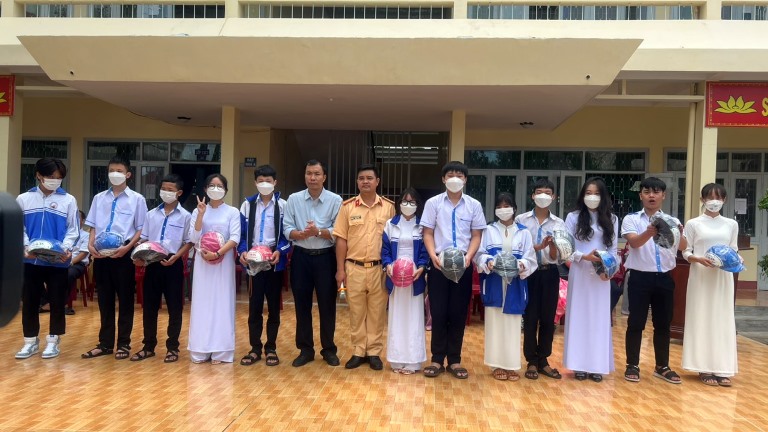 Trao mũ bảo hiểm cho các em học sinh có câu trả lời xuất sắc trong chương trình đố vui có thưởng