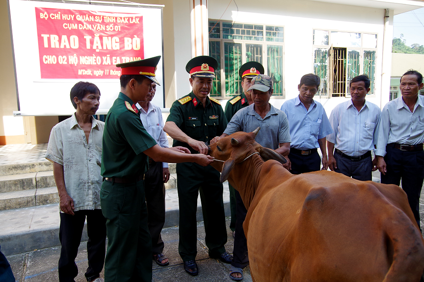 Cụm Dân vận số 1, Bộ Chỉ huy quân sự tỉnh ĐắkLắk trao tặng bò cho hộ nghèo xã Ea Trang, huyện M’Drắk