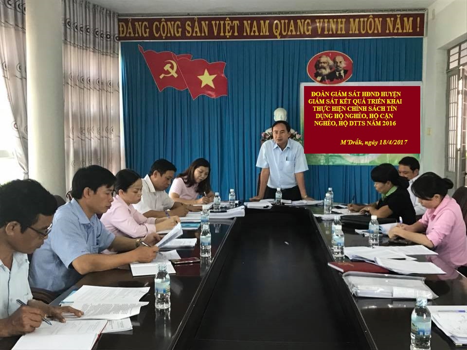 Thực hiện Nghị quyết số 17/NQ-HĐND, ngày 24/8/2016 của HĐND huyện về Chương trình giám sát của HĐND huyện năm 2017; Nghị quyết số 28/NQ-HĐND, ngày 27/12/2016 của HĐND huyện về thành lập đoàn giám sát của HĐND huyện năm 2017; Kế hoạch số 02/HĐND-ĐGS, ngày 14/3/2017 của Đoàn giám sát HĐND huyện về kế hoạch giám sát kết quả triển khai thực hiện chính sách tín dụng hộ nghèo, hộ cận nghèo, hộ dân tộc thiểu số năm 2016. Ngày 18/4/2017, Đoàn giám sát HĐND huyện do đồng chí Nguyễn Ngọc Bình, UVBTV, Chủ tịch HĐND huyện làm trưởng đoàn đã giám sát việc thực hiện chính sách tín dụng tại Phòng giao dịch Ngân hàng chính sách xã hội huyện M’Drắk.Tham gia đoàn giám sát có đồng chí Nguyễn Thị Thuyến, HUV, Phó Chủ tịch HĐND huyện, Phó Trưởng đoàn; các đồng chí Thường trực HĐND huyện; các Phó Ban HĐND huyện. Làm việc với đoàn giám sát có lãnh đạo, cán bộ Phòng giao dịch Ngân hàng Chính sách xã hội huyện và các Hội, Đoàn thể huyện.
