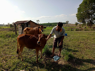 Ông Y Ơn Niê (buôn M'Lốc B, xã Krông Jing, huyện M'Đrắk) chăm sóc bò sinh sản do dự án hỗ trợ