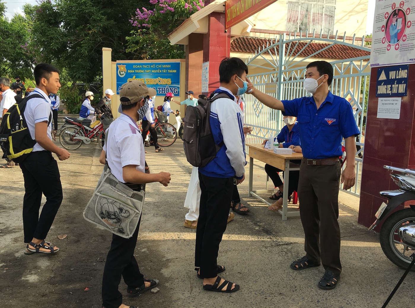 Theo đó, tại Trường THPT Nguyễn Tất Thành toàn bộ thầy cô giáo và các em học sinh đến trường đều phải đeo khẩu trang, được đo nhiệt độ và rửa tay sát khuẩn. Trường THPT Nguyễn Tất Thành hiện có 1.304 học sinh; Nhà trường đã phân các lớp học theo 2 ca, mỗi ca có 652 em để giữ khoảng cách phòng chống dịch; bố trí hai dãy bàn phía trước cổng để đo thân nhiệt và hướng dẫn các em học sinh rửa tay sát khuẩn trước khi vào lớp; chuẩn bị một phòng y tế để sẵn sàng khám, kiểm tra những học sinh có biểu hiện ho, sốt.
