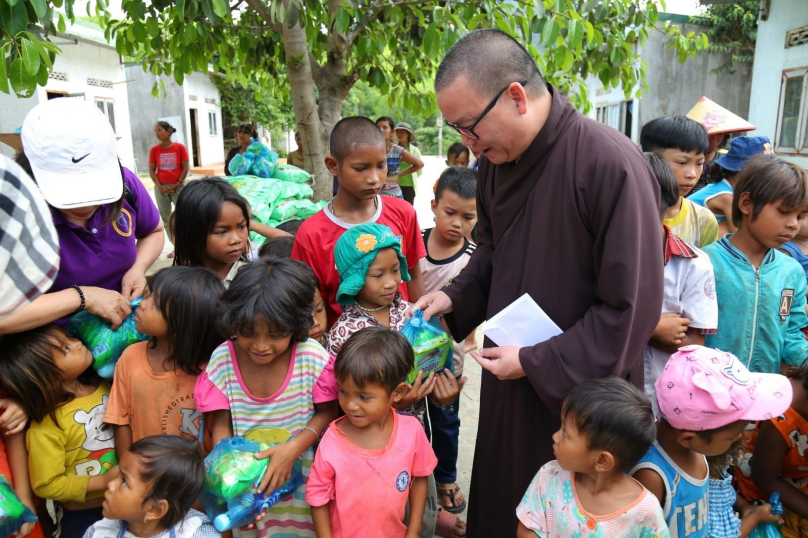 Đại diện Chùa Liên Trì trao quà cho các cháu thiếu nhi tại buôn M'Jam, xã Ea Trang