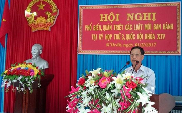 Sáng ngày 01/11/2017, UBND huyện M’Drắk đã tổ chức Hội nghị hưởng ứng Ngày pháp luật nước Cộng hoà xã hội chủ nghĩa Việt Nam năm 2017 và triển khai các luật mới ban hành tại kỳ họp thứ 3, Quốc hội khóa XIV. Tham dự hội nghị có 120 đại biểu đại diện Thường trực Huyện ủy, HĐND, UBND, UBMTTQVN huyện; lãnh đạo các ban của Huyện ủy, Văn phòng Huyện ủy, các cơ quan, đơn vị thuộc UBND huyện, các đoàn thể của huyện; đại diện Thường trực HĐND, UBND, UBMTTQVN, công chức Tư pháp - Hộ tịch, Trưởng Công an các xã, thị trấn; lãnh đạo các cơ quan thuộc ngành dọc, các doanh nghiệp nhà nước có trụ sở đóng trên địa bàn huyện; báo cáo viên pháp luật của huyện. Ông Y Bới Byă - Phó Chủ tịch UBND huyện chủ trì hội nghị..png)