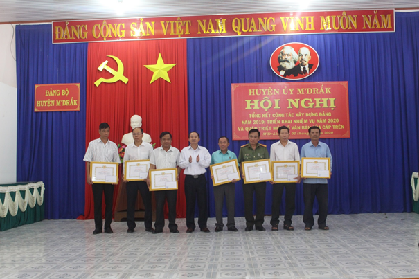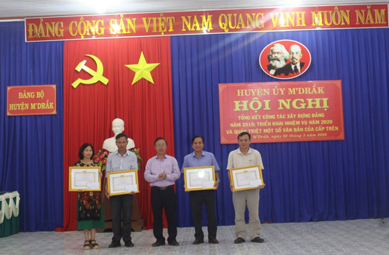 Tại hội nghị, Ban Thường vụ Huyện ủy M’Drắk đã trao Giấy khen tặng 8 TCCSĐ có thành tích xuất sắc trong công tác phát triển đảng viên mới năm 2019; 2 TCCSĐ đạt trong sạch vững mạnh tiêu biểu năm 2019; 2 chi bộ trực thuộc đảng bộ cơ sở đạt trong sạch vững mạnh tiêu biểu 5 năm liền và 7 đảng viên hoàn thành xuất sắc nhiệm vụ tiêu biểu 5 năm liền (2015-2019); công nhận 6 TCCSĐ đạt tiêu chuẩn hoàn thành xuất sắc nhiệm vụ năm 2019.