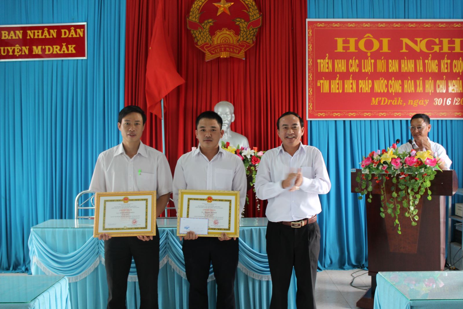 Hội nghị cũng đã tổng kết và trao giải cuộc thi "Tìm hiểu Hiến pháp Nước cộng hòa xã hội chủ nghĩa Việt Nam". Cuộc thi "Tìm hiểu Hiến pháp nước cộng hòa xã hội chủ nghĩa Việt Nam" được huyện M'đrắk phát động từ ngày 14/11/2014 đến hết ngày 25/2/2015. Sau hơn 3 tháng triển khai Ban tổ chức đã nhận được 5.075 bài dự thi của cac thí sinh đến từ 87 cơ quan, đơn vị trong toàn huyện. Trong đó, có 250 bài của cán bộ, công chức, đoàn viên các cơ quan ban, ngành, đoàn thể của huyện; 2.426 bài của cán bộ, công chức và nhân dân các xã, thị trấn; 2.399 bài của cán bộ, viên chức, giáo viên, học sinh các trường học và 580 bài dự thi của người dân tộc thiểu số. Kết quả, Ban tổ chức đã trao 01 giải nhất, 01 giải nhì, 02 giải ba và 05 giải khuyến khích cho 09 tập thể; trao 01 giải nhất, 02 giải nhì, 03 giải ba và 10 giải khuyến khích cho 16 cá nhân có số điểm cao; ngoài ra Ban tổ chức cũng đã chọn 25 bài thi xuất sắc gửi tham gia cuộc thi "Tìm hiểu Hiến pháp nước cộng hòa xã hội chủ nghĩa Việt Nam" cấp tỉnh.