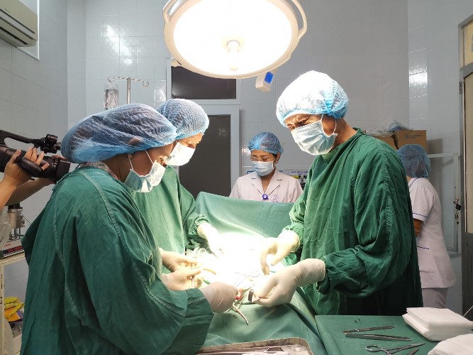 Đội ngũ y bác sỹ Trung tâm y tế huyện thực hiện kíp mổ cấp cứu bệnh nhân