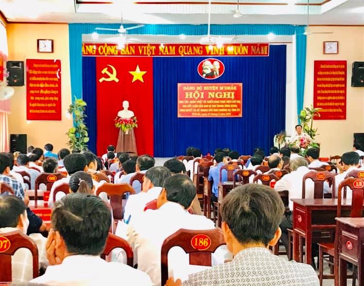 Sáng ngày 27/8/2019, Ban Thường vụ Huyện uỷ M'Drắk đã tổ chức Hội nghị cán bộ chủ chốt của huyện để học tập, quán triệt, tuyên truyền và triển khai Kế hoạch của Ban Thường vụ Tỉnh uỷ, Chỉ thị và các Kết luận của Ban Bí thư Trung ương Đảng. Đồng chí Vũ Hữu Nhân - Phó Bí thư Thường trực Huyện ủy, chủ trì Hội nghị.Sau khi phát biểu khai mạc hội nghị đồng chí Vũ Hữu Nhân - Phó Bí thư Thường trực Huyện ủy đã trực tiếp quán triệt, triển khai các nội dung: Kế hoạch số 87-KH/TU, ngày 24/12/2018 của Tỉnh uỷ về thực hiện Nghị quyết số 26-NQ/TW, ngày 19/5/2018 của Ban chấp hành Trung ương Đảng, khoá XII về "Tập trung xây dựng đội ngũ cán bộ các cấp, nhất là cấp chiến lược, đủ phẩm chất, năng lực và uy tín, ngang tầm nhiệm vụ"; Nghị quyết số 11-NQ/TU, ngày 30/5/2019 của Ban Thường vụ Tỉnh uỷ về "Xây dựng lực lượng Công an xã chính quy"; Chỉ thị số 33-CT/TW, ngày 18/3/2019 của Ban Bí thư Trung ương Đảng về "Tăng cường xây dựng tổ chức Đảng trong các đơn vị kinh tế tư nhân".
