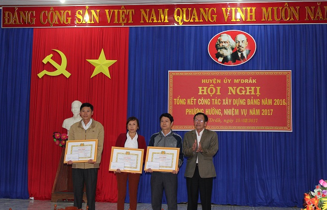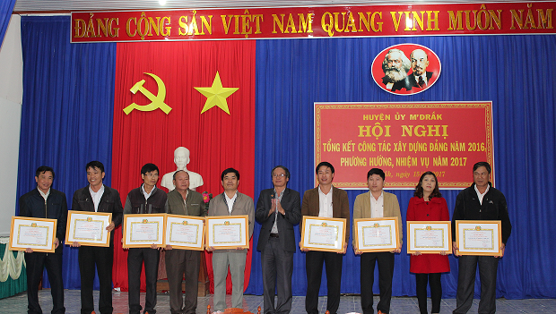 Nhân dịp này, Huyện uỷ M’Drắk đã tặng Giấy khen cho 05 TCCS Đảng đạt trong sạch vững mạnh tiêu biểu năm 2016; 03 chi bộ trực thuộc Đảng bộ cơ sở 5 năm liên tục đạt trong sạch vững mạnh tiêu biểu (2012-2016); 04 tổ chức cơ sở đảng có thành tích xuất sắc phát triển Đảng viên năm 2016; 04 đảng viên hoàn thành xuất sắc nhiệm vụ tiêu biểu 5 năm liên tiếp (2012-2016); đồng thời đề nghị Tỉnh uỷ Đắk Lắk tặng cờ cho 02 TCCS Đảng đạt TSVM tiêu biểu 5 năm liền (2012-2016); tặng bằng khen cho 02 TCCS Đảng đạt TSVM 5 năm liền (2012-2016)…