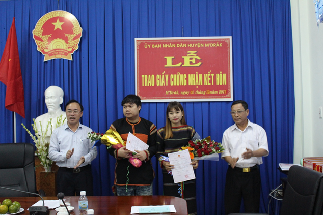 Chiều ngày 05/12/2017, UBND huyện M’Drắk đã tổ chức Lễ trao giấy chứng nhận kết hôn cho cặp vợ chồng: chị H Biêng Niê (quốc tịch Việt Nam) - anh Byă Y Non (quốc tịch Việt Nam, cư trú tại Mỹ). Tham dự buổi Lễ có đại diện lãnh đạo UBND huyện, Phòng Tư pháp, UBND xã Krông Jing và người thân hai bên gia đình.