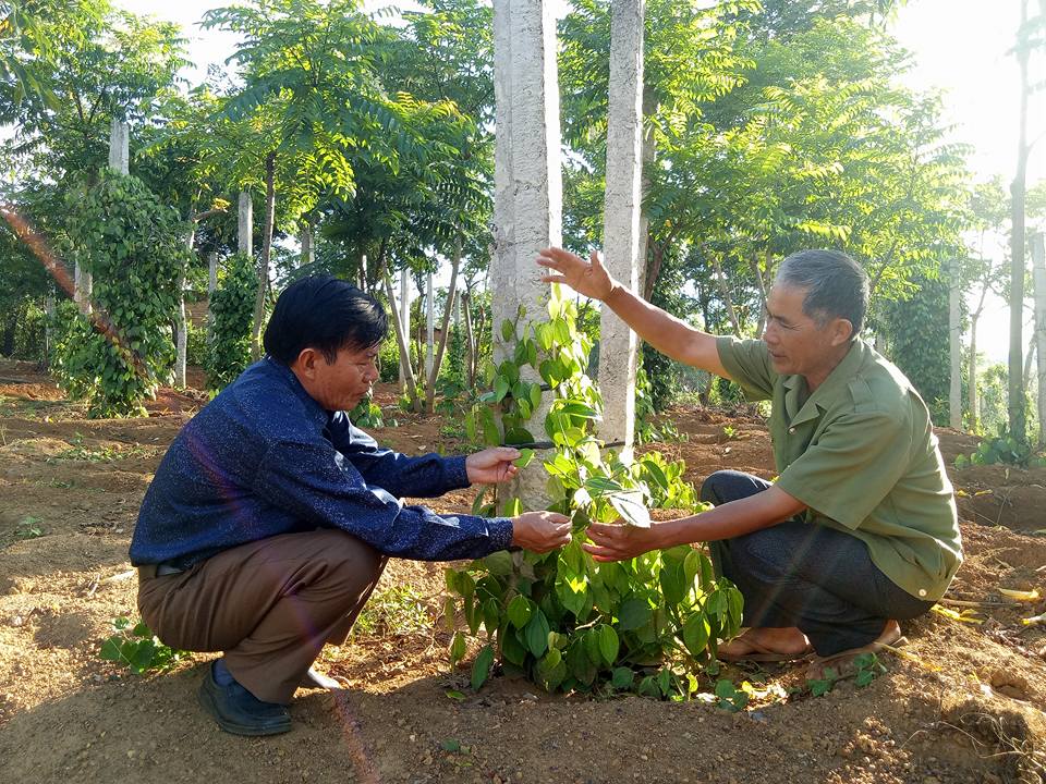 Bệnh binh Hồ Như Thật ở Thôn 4 (xã Krông Jing) chia sẻ cách trồng hồ tiêu hiệu quả của gia đình