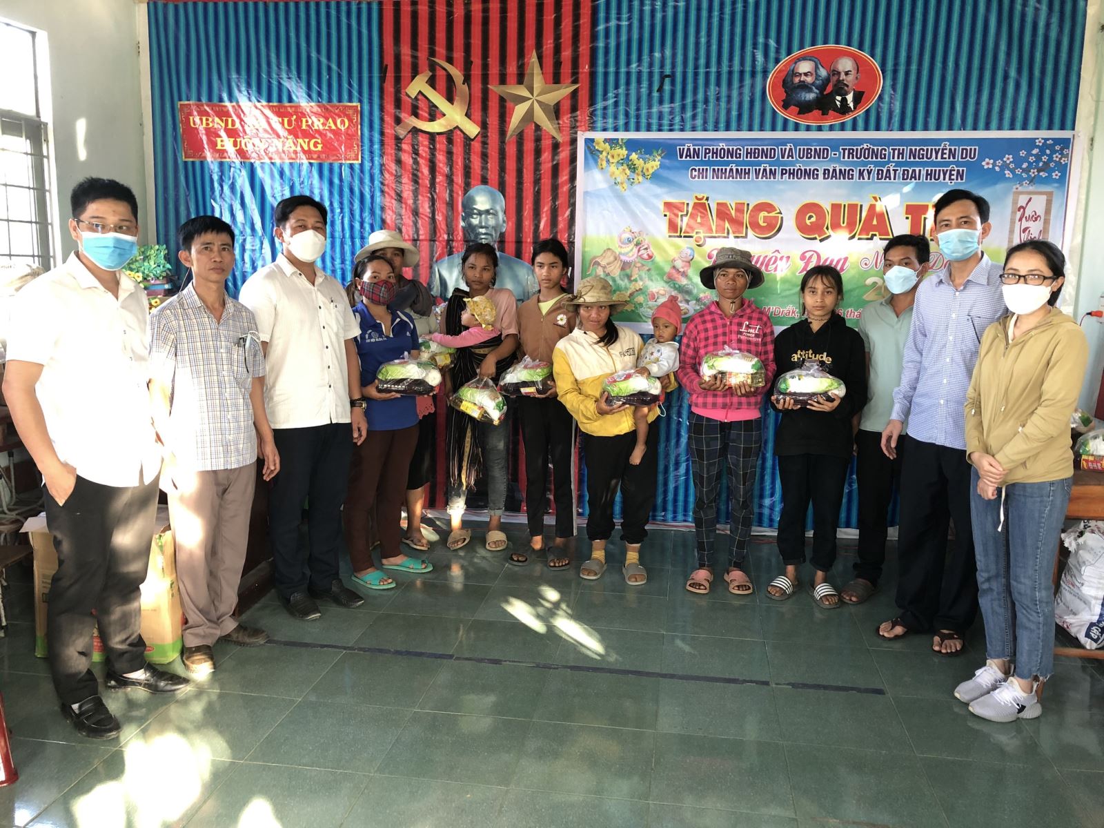 Ngày 26/01/2022, Đoàn công tác của Văn phòng HĐND&UBND huyện do đồng chí Trần Tiến Duật, Chánh Văn phòng HĐND&UBND huyện làm Trưởng đoàn phối hợp với trường Tiểu học Nguyễn Du, Chi nhánh Văn phòng đăgn ký đất đai huyện đã đến thăm và tặng 190 suất quà cho các hộ nghèo, hộ cận nghèo (tổng trị giá 13.300.000 ngàn đồng) của buôn Năng, xã Cư Prao, huyện M’Drắk, tỉnh Đắk Lắk.Đến thăm và tặng quà bà con trong buôn Năng, đồng chí Trần Tiến Duật thông qua lãnh đạo buôn đã hỏi thăm tình hình đời sống, công tác phòng, chống dịch bệnh COVID-19 của nhân dân trên địa bàn. Bên cạnh đó, lãnh đạo Văn phòng HĐND&UBND huyện mong muốn cấp ủy, Ban Tự quản buôn tiếp tục quan tâm, huy động mọi nguồn lực giúp bà con trong buôn tiếp tục phát huy khối đại đoàn kết toàn dân, tích cực lao động sản xuất, xây dựng buôn làng ngày càng ấm no, hạnh phúc.