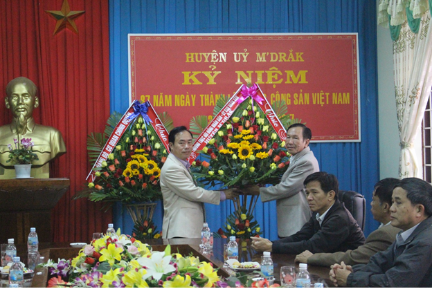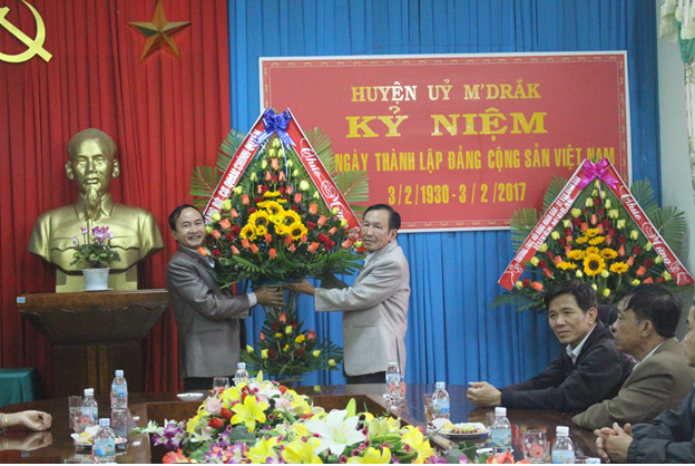 Thay mặt Thường trực HĐND, UBND huyện, Đảng uỷ cơ quan Chính quyền đồng chí Hoà Quang Khiêm – Phó Bí thư, Chủ tịch UBND huyện; đồng chí Nguyễn Ngọc Bình – Chủ tịch HĐND huyện, Bí thư Đảng uỷ cơ quan Chính quyền đã trao những lẵng hoa tươi thắm, cùng những lời chúc tốt đẹp nhất đến các đồng chí Thường trực Huyện ủy, lãnh đạo các cơ quan tham mưu xây dựng Đảng và Văn phòng Huyện ủy nhân dịp kỷ niệm 87 năm ngày thành lập Đảng cộng sản Việt Nam và đầu xuân Đinh Dậu 2017.