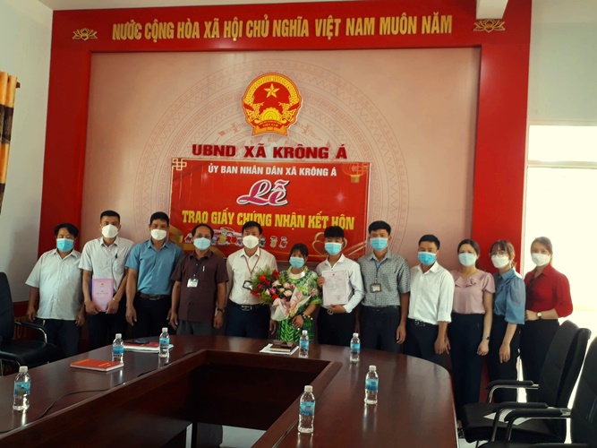 Ngày 16/3/2022, UBND xã Krông Á đã phối hợp với Phòng Tư pháp huyện M’Drắk tổ chức lễ trao giấy chứng nhận kết hôn cho cặp đôi cô dâu- chú rể và tuyên truyền Luật Hôn nhân gia đình, vận động các gia đình tổ chức đám cưới theo nếp sống mới, đảm bảo công tác phòng chống dịch Covid- 19. Tới dự buổi lễ có các đồng chí: Hồ Xuân Thương- Trưởng phòng Tư pháp huyện; lãnh đạo Đảng ủy- HĐND- UBND- MTTQ xã và các tổ chức đoàn thể; cán bộ, công chức xã..jpg)