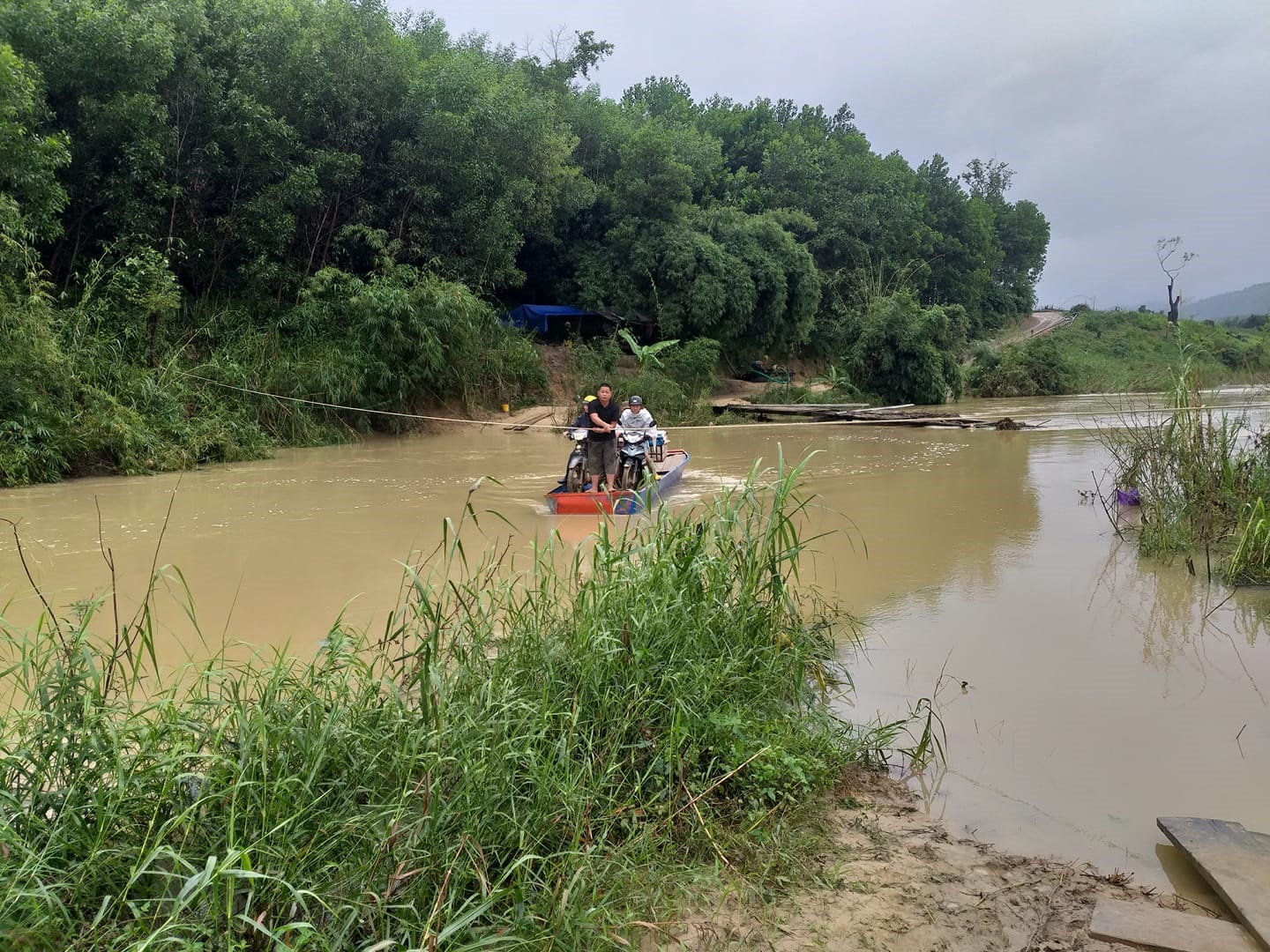 Giáo viên Trường Tiểu học Bùi Thị Xuân đi thuyền qua suối để đến trường trong mùa mưa